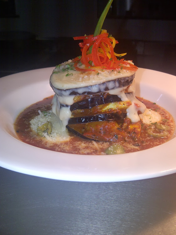 - When ready, lightly oil a tray Layer the eggplant slices on the bottom. Add the meat sauce and spread to cover the eggplant. Layer the potato slices to cover the meat sauce and sprinkle with the bread crumbs. Finally spread the cheese topping to thinly cover the potatoes.