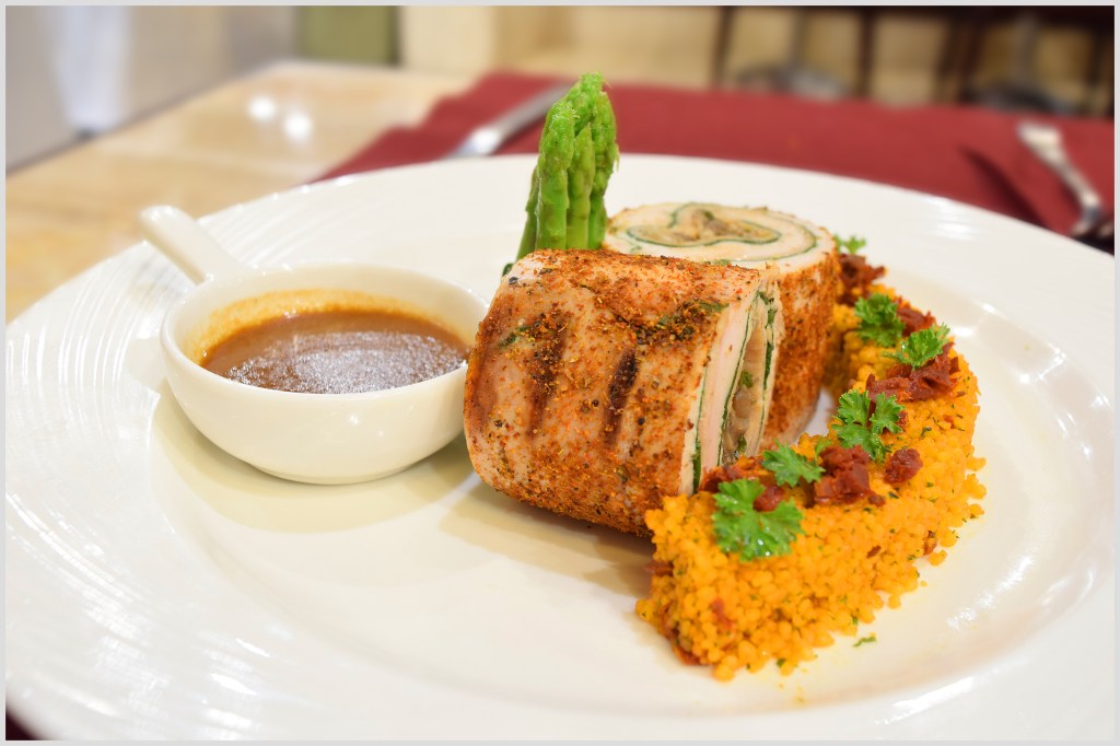 - When ready to serve, cut ¼-inch slices from each roulade, discarding ends. Place 2 chicken roulade slices on each Saffron Risotto Round.