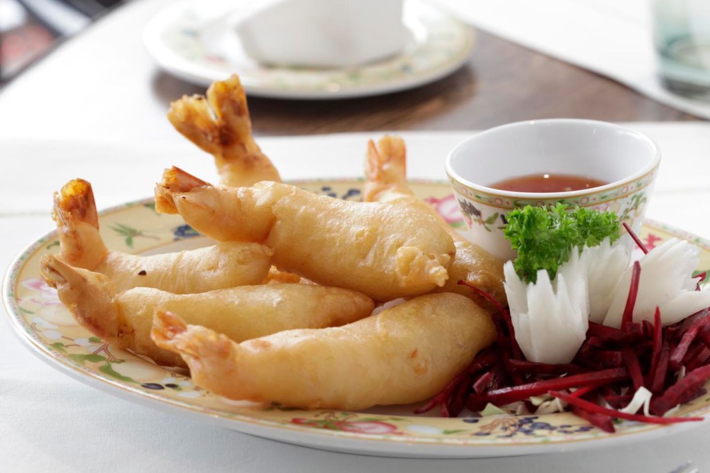 Heat sufficient oil in a wok, dip marinated prawns in the batter by holding the tail and deep-fry on medium heat, turning frequently, for two to three minutes or until crisp and golden brown.