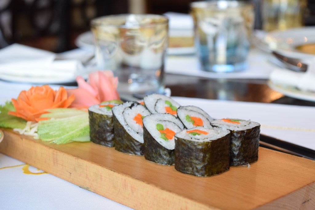 Cut the sushi roll into bite-size pieces, served with pickled ginger, wasabi & kikkoman soy sauce.