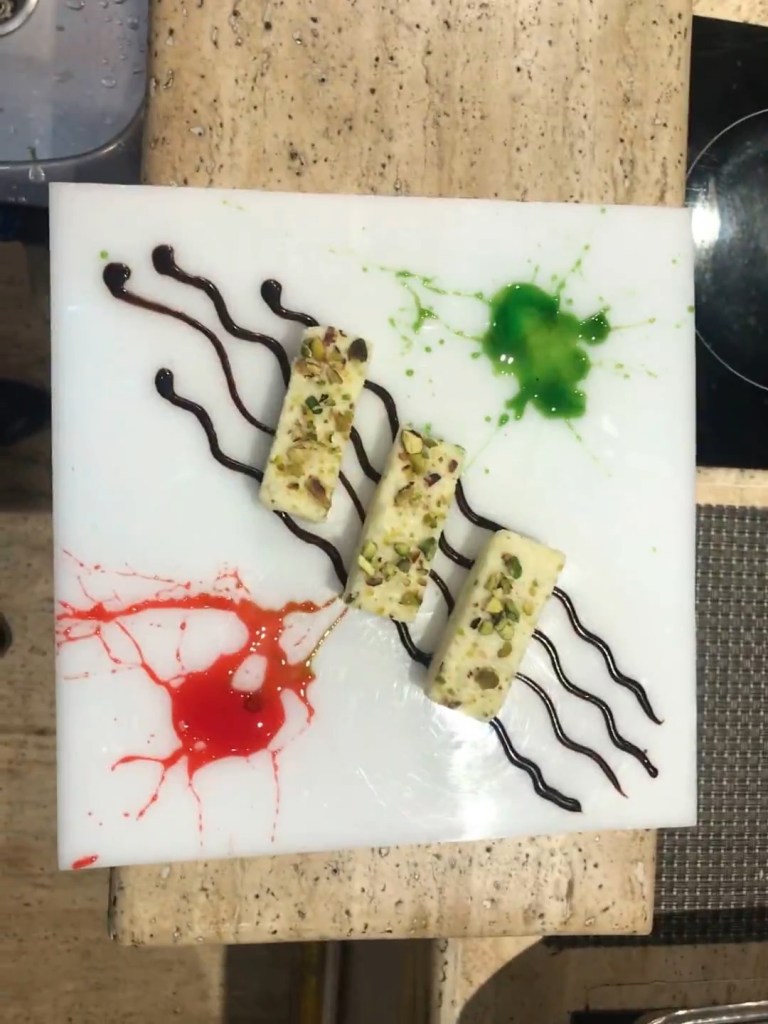 - Pour this prepared mixture in a pan and add pistachios to it. Let the mixture cool and cut the barfi into desired shapes. Garnish it with silver vark and almonds and serve!