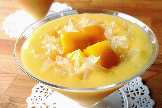 4) To serve, portion out to individual serving bowls and garnish with pomelo sacs and cubed mangoes.