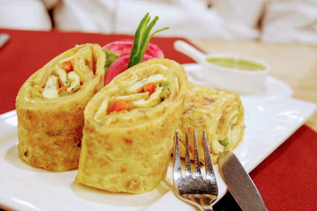 Assemble Kathi Roll- Spread 2 teaspoons of chutney on cooked paratha. Add 2 to 3 spoonfuls of the filling in the middle. Add few sliced onions and cilantro on top. roll the sides up to the middle. You can use small toothpicks to hold them together.