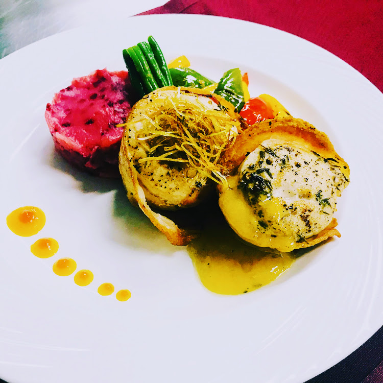 - Arrange the steamed vegetable on the edge then de-mold the beet mash, arrange chicken medallion on the top of the veggies.