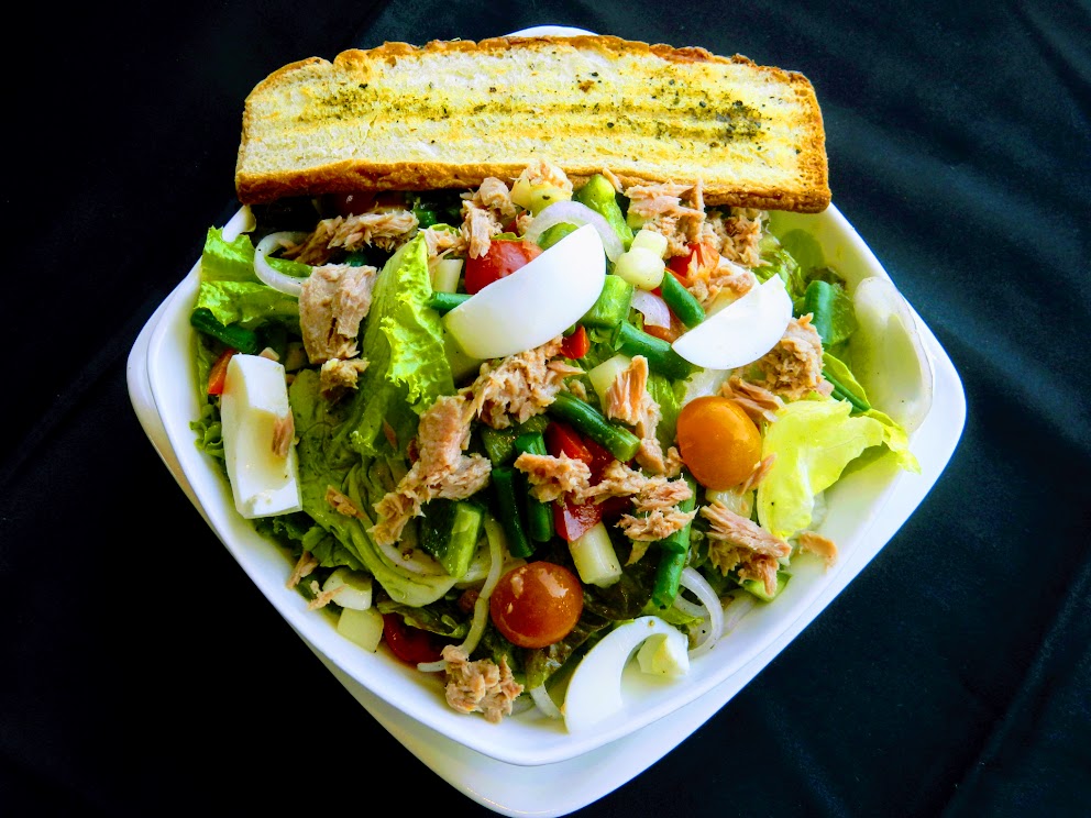 Add the green beans, mixed beans, cherry tomatoes and spring onions, lettuce, avocado to the dressing and mix. Flake the tuna on top and add the hard-boiled eggs. Season with black pepper. and enjoy this healthy preparation before or after exercise.