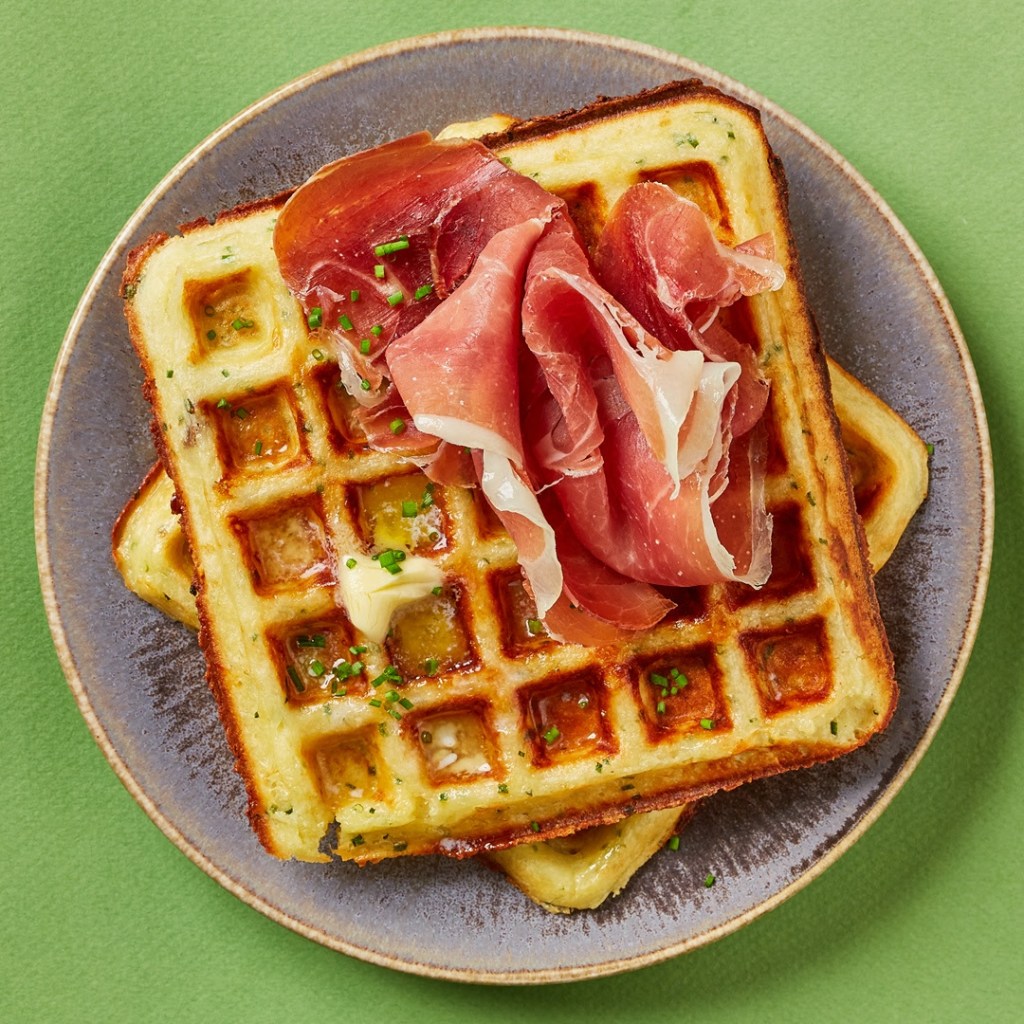Serve hot the waffles with maple syrup and a few grinds of fresh cracked pepper, and prosciutto ham on the top. very delicious and healthy recipe to go with.
