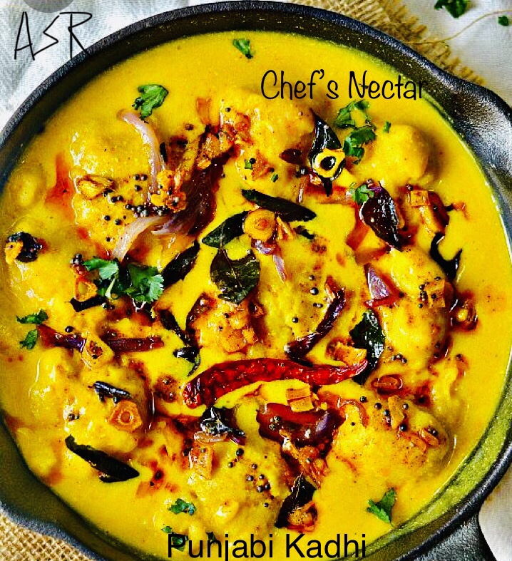 Kadhi or karhi is a dish originating from the Indian subcontinent mostly every where it has it own version and method of preparation, I have made a North Indian most famous and common home made dish Punjabi Kadhi which is rich with tangy flavor and loved by everyone at home. Kadhi consists of a thick gravy based on chickpea flour, and contains vegetable fritters called pakoras, to which dahi is added to give it a bit of sour taste. It is often eaten with boiled rice or roti.