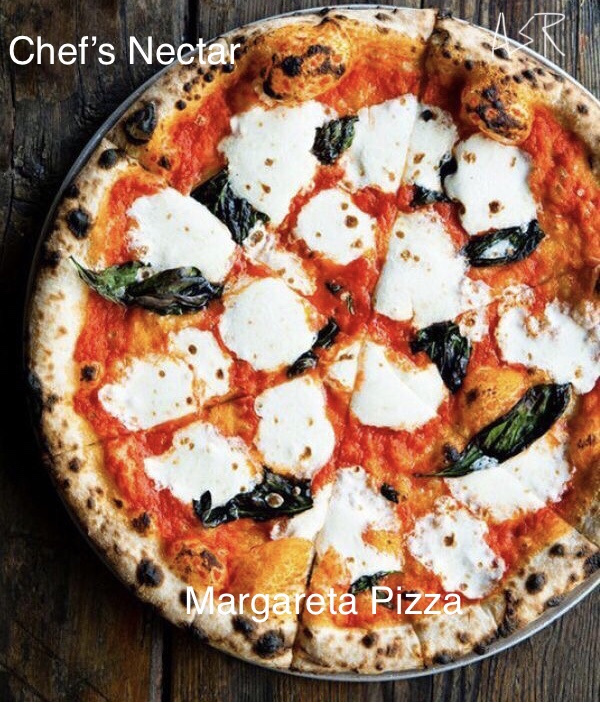 Pizza Margherita is a typical Neapolitan pizza, made with San Marzano tomatoes, mozzarella cheese, fresh basil, salt and extra-virgin olive oil. Traditionally, it is made with fior di latte rather than buffalo mozzarella.