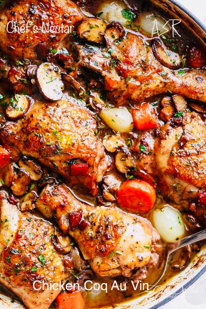 Coq au vin is a French dish of chicken braised with wine, lardons, mushrooms, and optionally garlic. A red Burgundy wine is typically used, though many regions of France make variants using local wines, such as coq au vin jaune, coq au Riesling, coq au pourpre or coq au violet, coq au Champagne. As per your preferences 😋🥂