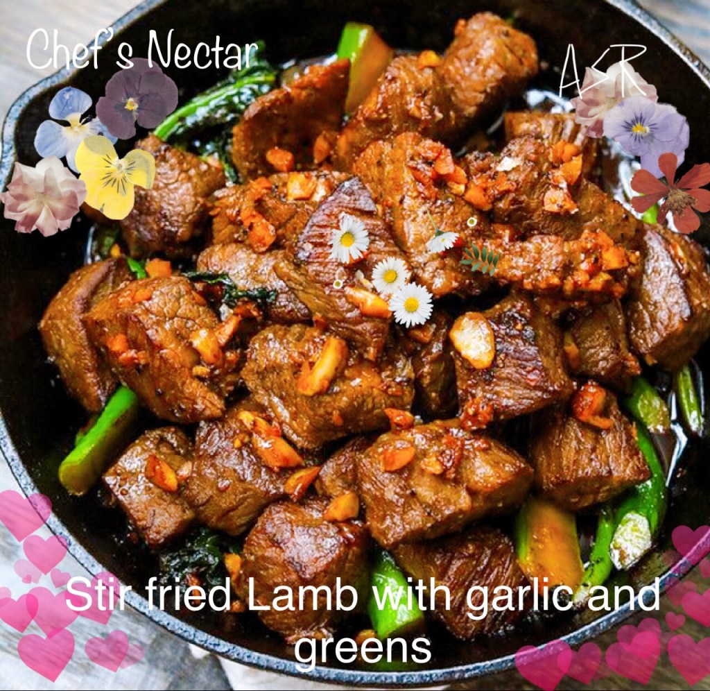 - Now arrange the green in the serving dish and arrange the cooked lamb on the top of the vegetables. Served hot garnished with garlic flakes, scallions and edible flowers.