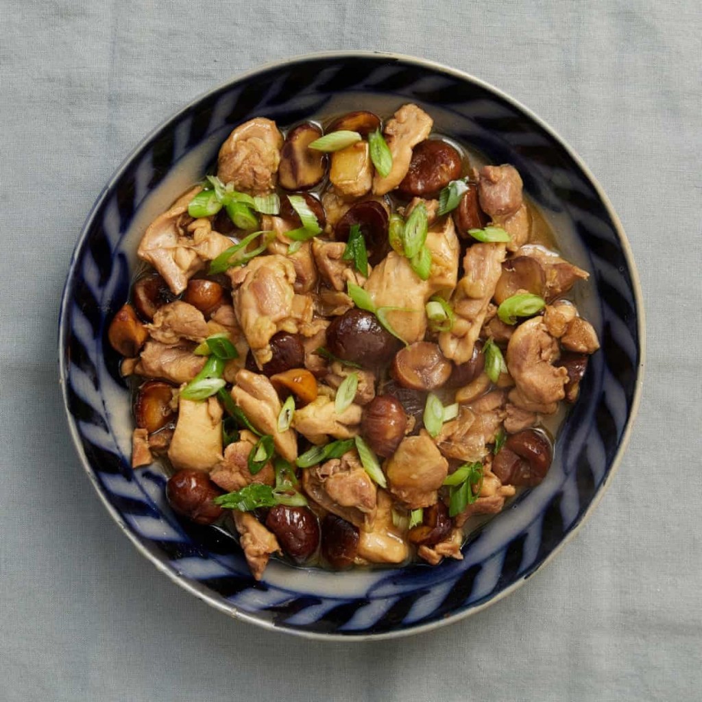 Splash the Shaoxing wine into the wok and stir well, then tip in the stock or water. Bring to a boil, then add the sugar, soy sauce and chestnuts, along with salt to taste (three quarters of a teaspoon should do). Reduce the heat, cover and simmer for about 15 minutes to allow the chicken to cook through and the chestnuts to absorb some of the flavours of the sauce, stirring from time to time.