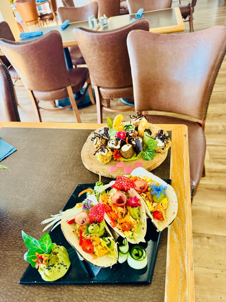 - To assemble: start with pieces of fish then add remaining ingredients finishing with a generous sprinkle of cotija cheese and finally that awesome taco sauce, Serve with a fresh lime wedge to squeeze over tacos. I decorate it with cherry tomatoes, sliced roasted ham and tulle to make it more appealing and beautiful